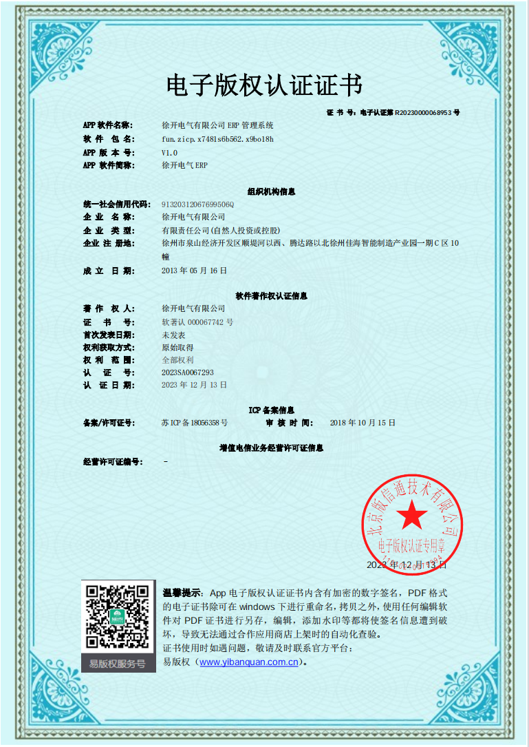 徐开电气ERP管理系统软著